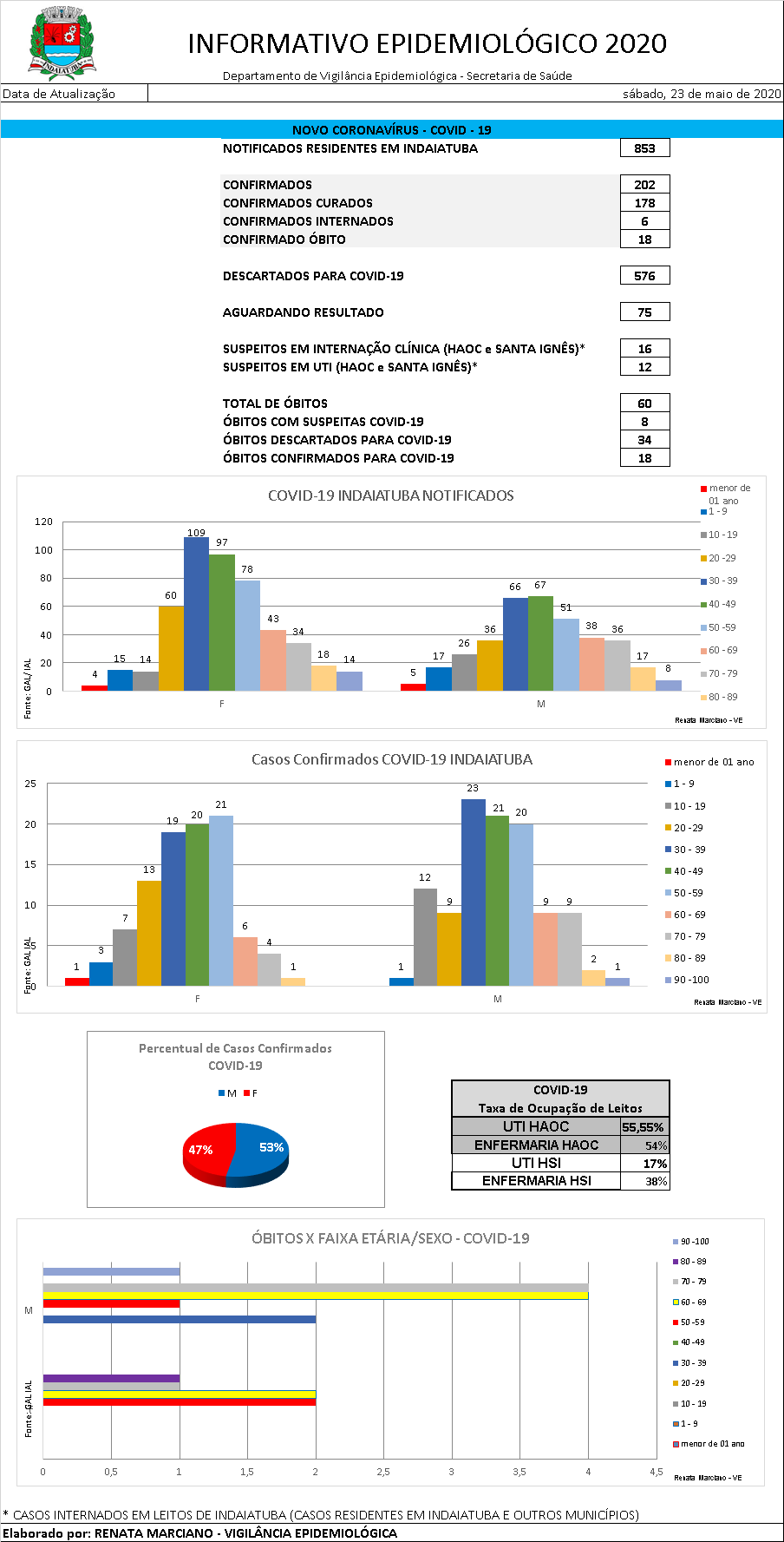 Até este momento foram acrescentadas SEIS notificações; CINCO casos positivos e outros 13 foram descartados. Sendo assim, Indaiatuba tem 853 notificações; 202 confirmados com Covid-19, sendo que 18 vieram a óbito; 178 estão curados e SEIS confirmados estão internados. Ainda há OITO mortes em investigação e outros 75 casos suspeitos aguardando resultado. Atualmente há 16 internados em leito clínico e 12 em UTI (Unidade de Terapia Intensiva).