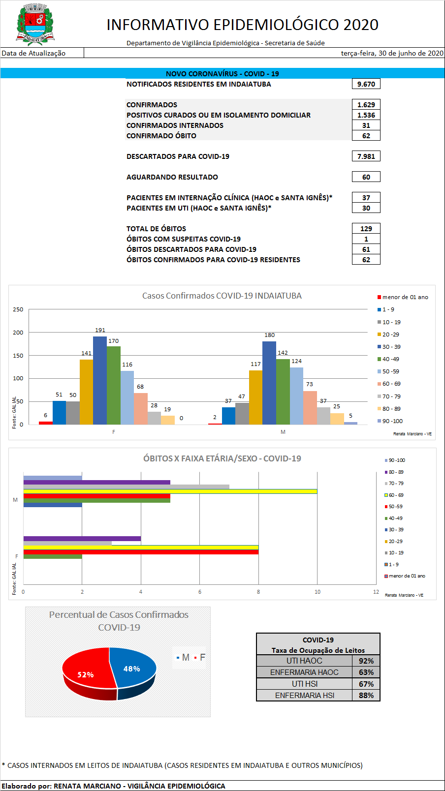 Na data de hoje foram acrescentadas 560 notificações, e outros 130 casos positivos de Covid-19, além disso, foram descartados 470 suspeitos. Sendo assim, Indaiatuba soma 9.670 notificações; 1.629 confirmados, sendo que 62 evoluíram a óbito; 1.536 são considerados curados ou estão em recuperação domiciliar e 31 confirmados estão internados. Ainda há outros 60 casos suspeitos aguardando resultado. Atualmente há 37 internados em leito clínico e 30 em UTI (Unidade de Terapia Intensiva). A taxa de ocupação dos leitos clínicos é de 63% para o Haoc e 88% para o Hospital Santa Ignês, referente aos leitos de UTI para o Haoc é de 92% e para o Hospital Santa Ignês 67%.