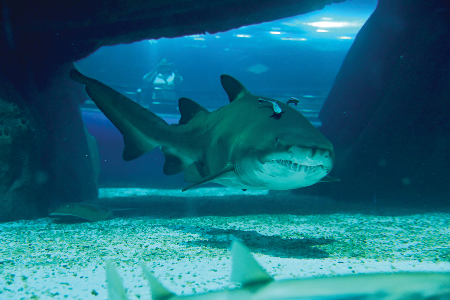 Há duas etapas para observar o tanque. O primeiro impacto é no salão principal, onde se vê os animais flutuarem tranquilamente. Dali, os visitantes seguem por um túnel que dá a sensação de estar dentro d’água. Arraias passam sobre as nossas cabeças, enquanto tubarões deslizam acompanhados de outros peixinhos em uma relação de simbiose. E todo mundo filma e fotografa sem parar.