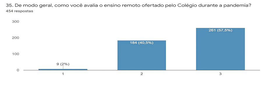 A pesquisa iniciou-se com alunos e os pais, e foram analisados todos os aspectos relacionados ao ensino remoto. O tempo para resposta encerrou-se na quarta-feira (dia 8 de julho) e, na sexta (dia 10), foi enviada a devolutiva aos alunos e aos pais. Após analisar os resultados, observou-se que, apesar do distanciamento físico, família e escola estão em absoluta conexão.
