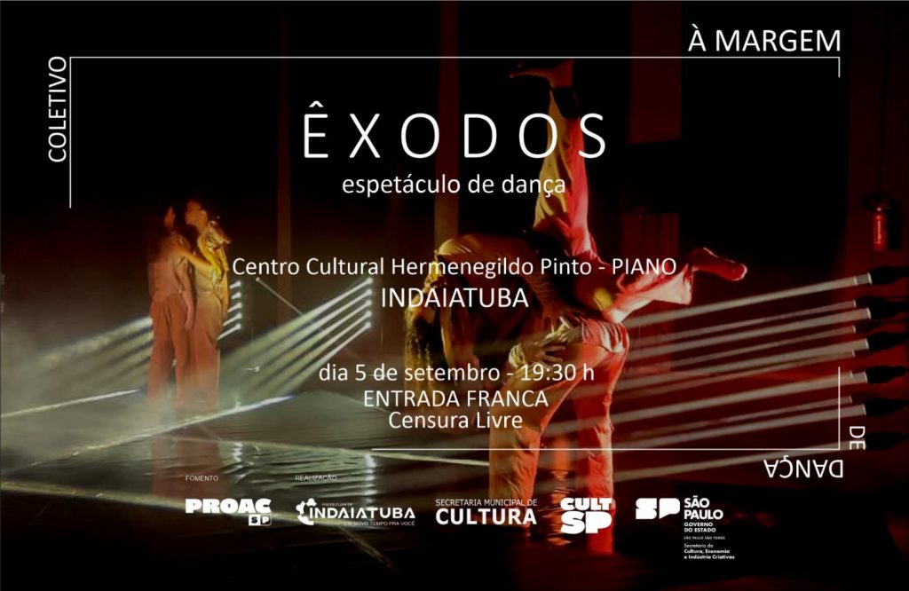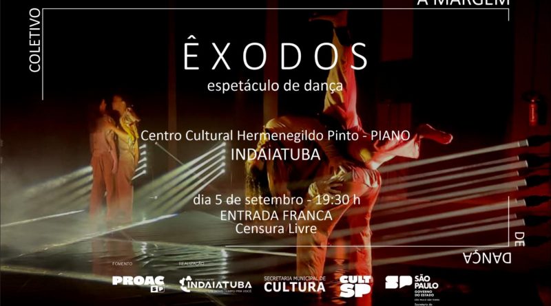 Indaiatuba, através da Secretaria de Cultura, traz o Coletivo de Dança À Margem para apresentação nesta sexta-feira, 05 de setembro, do espetáculo inédito Êxodos, no Centro Cultural Piano. A apresentação tem início às 19h30 e a entrada é gratuita, aberta a todos os públicos.