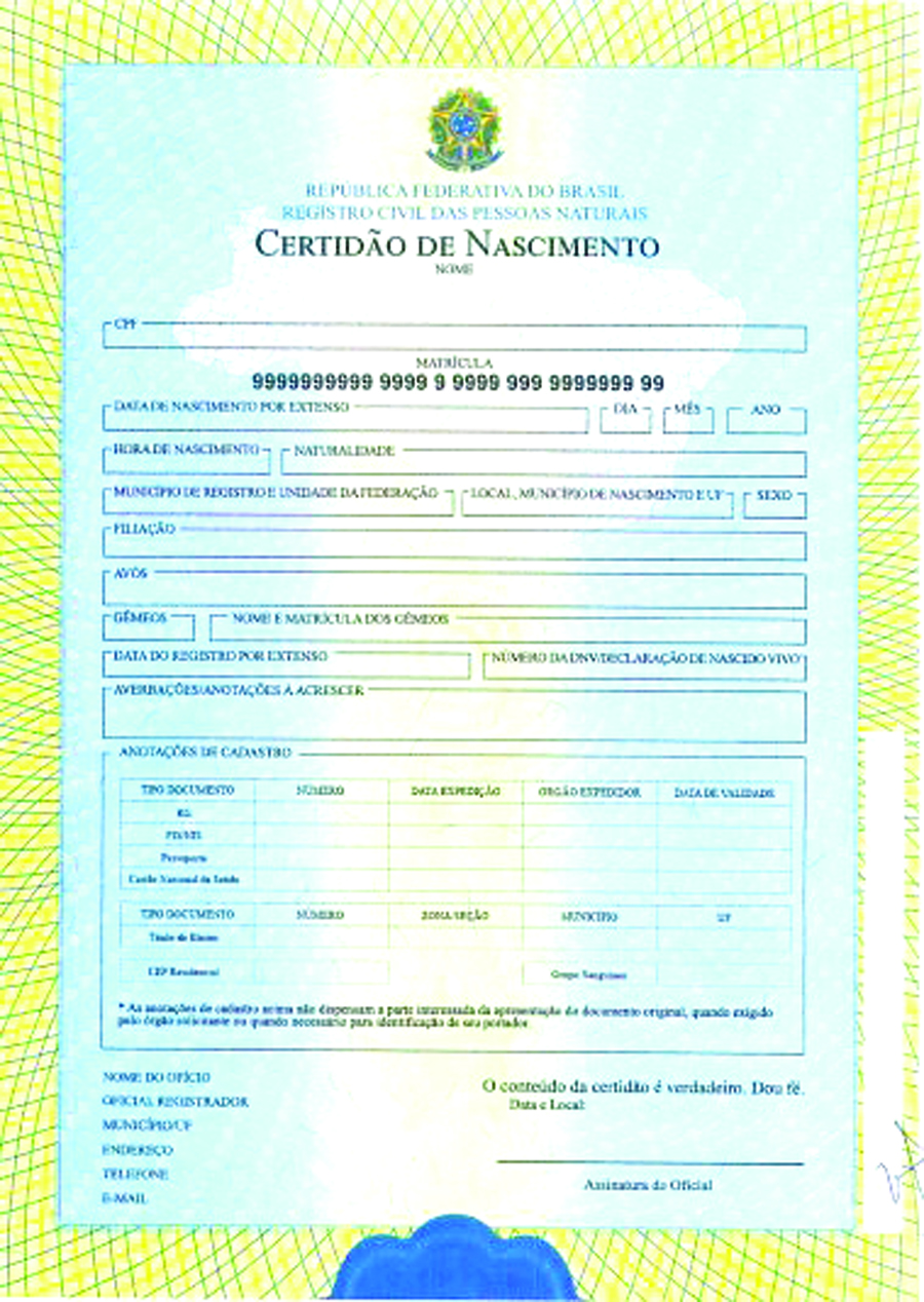 A nova certidão de nascimento não deve conter quadros preestabelecidos para o preenchimento dos genitores. Essa determinação visa a evitar que uma lacuna para identificação do pai fique em branco, no caso, por exemplo, de um pai desconhecido. Segundo a Norma, os novos modelos deverão ser implementados até o dia 1º de janeiro de 2018.