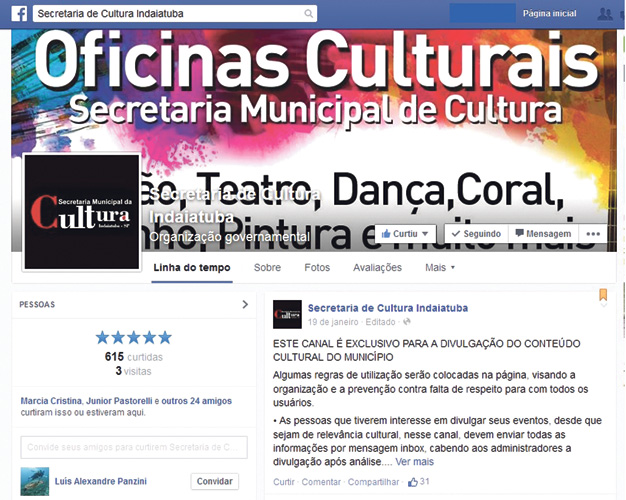 Já está no ar no Facebook a página da Secretaria de Cultura de Indaiatuba. Ao acessar o endereço https://www.facebook.com/SecretariaDeCulturaIndaiatuba?fref=ts a população conta com mais um canal de informação sobre a programação cultural da cidade, incluindo eventos, oficinas culturais, festivais, workshops, shows e todas as atividades gratuitas promovidas pela secretaria mensalmente no município, além de conferir novidades sobre o segmento e deixar seus comentários. Para receber regularmente as atualizações, basta o interessado clicar na opção ‘seguir’ no alto da página. Com a presença na rede social, a Secretaria de Cultura oferece mais uma alternativa aos munícipes, que podem conferir também todas as notícias divulgadas no site www.indaiatuba.sp.gov.br .