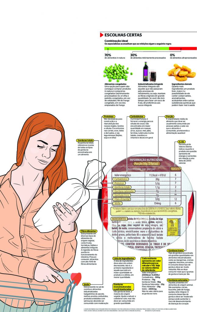 É preciso ficar bem atento ao que está escrito no rótulo e consumir o mínimo possível de gordura e sódio. Em contrapartida, é fundamental dar preferência às fibras.