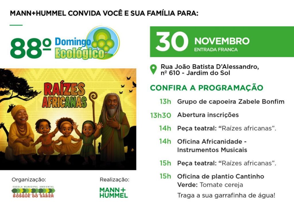 A programação começa às 13h e traz atrações que aliam entretenimento e educação ambiental: apresentações de capoeira, peças teatrais, oficinas de musicalidade e de plantio, e atividades voltadas ao fortalecimento das tradições culturais. Entre os destaques estão a peça teatral “Raízes Africanas”, a Oficina Africanidade – Instrumentos Musicais e a Oficina de Plantio Cantinho Verde (tomate cereja), destinada a ensinar práticas de horta doméstica e cultivo sustentável.