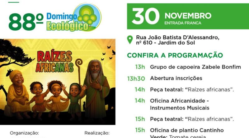 A Secretaria Municipal de Educação convida a população para a 88ª edição do Domingo Ecológico, que será realizada neste domingo, 30 de novembro, no Bosque do Saber (Rua João Batista D’Alessandro, nº 610 – Jardim do Sol). A entrada é franca. O evento terá programação especial com atividades educativas, culturais e de lazer pensadas para todas as idades.
