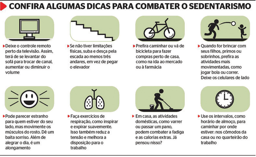 Ele sugere que pessoas que trabalham sentadas diariamente levantem-se a cada uma hora ou hora e meia, para andar e esticar a coluna, principalmente. Uma parada de 15 a 20 minutos fará continuar a atividade um pouco mais relaxado, garante.