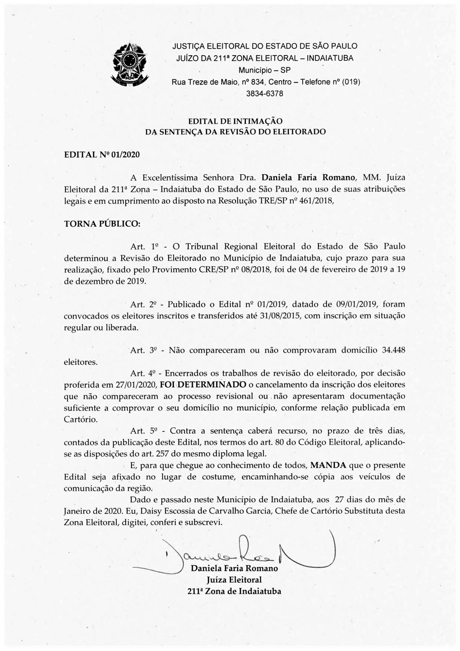 Cidade Edital de intimação da sentença da revisão do eleitorado 31/01/202031/01/2020 Redacao Edital de intimação da sentença da revisão do eleitorado Não compareceram ou não comprovaram domicílio 34.448 eleitores e Foi determinado o cancelamento.