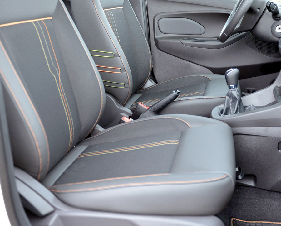 Discreta, a cabine traz bancos com pespontos coloridos e elásticos para transporte de pequenos objetos, além de pedaleiras esportivas e apliques nas soleiras das portas. As mudanças acrescentam R$ 3.930 à tabela da versão SE 1.0, da qual a opção Trail deriva.