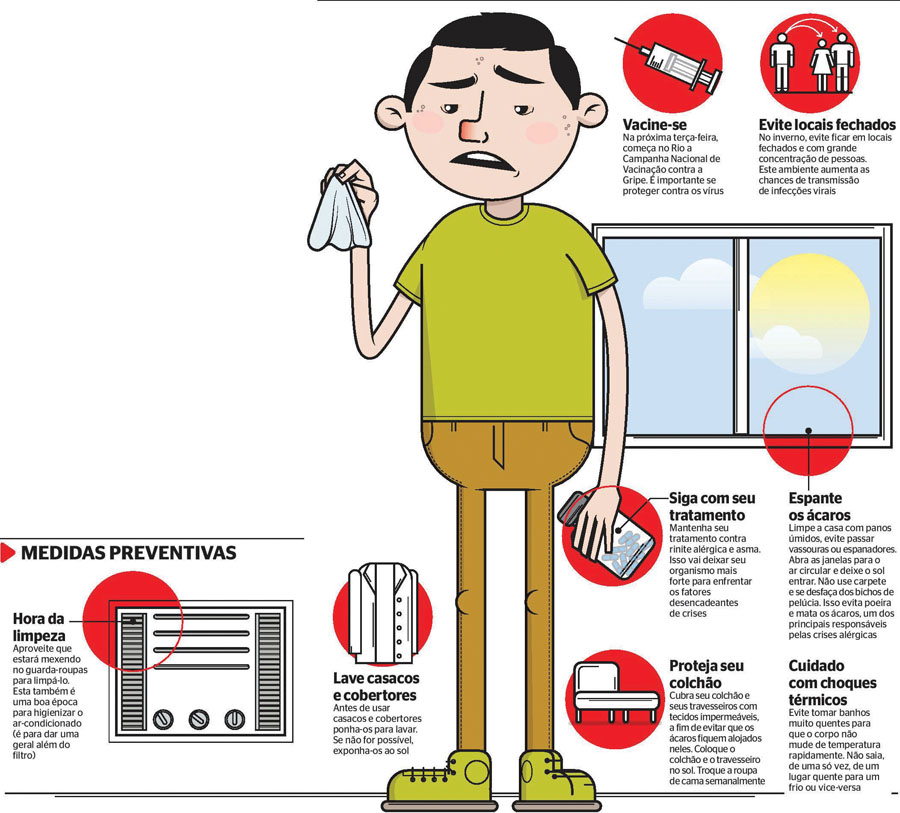 “Além de tratar a alergia durante o ano todo, no inverno temos que tomar medidas para nos protegermos das infecções virais, como tomar a vacina contra a Influenza, evitar aglomerações de pessoas, lavar as narinas com soro fisiológico, evitar ficar perto de pessoas que estejam doentes e lavar as mãos frequentemente” – recomenda Ekaterini.