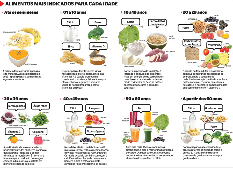 Com o passar dos anos, o paladar muda e os nutrientes necessários para o bom funcionamento do corpo também. Quem nunca ouviu que a criança tem que beber leite para crescer com ossos fortes? A alimentação é um dos pilares da vida saudável. Com a ajuda de especialistas, listamos os alimentos mais indicados para serem consumidos de acordo com cada idade.