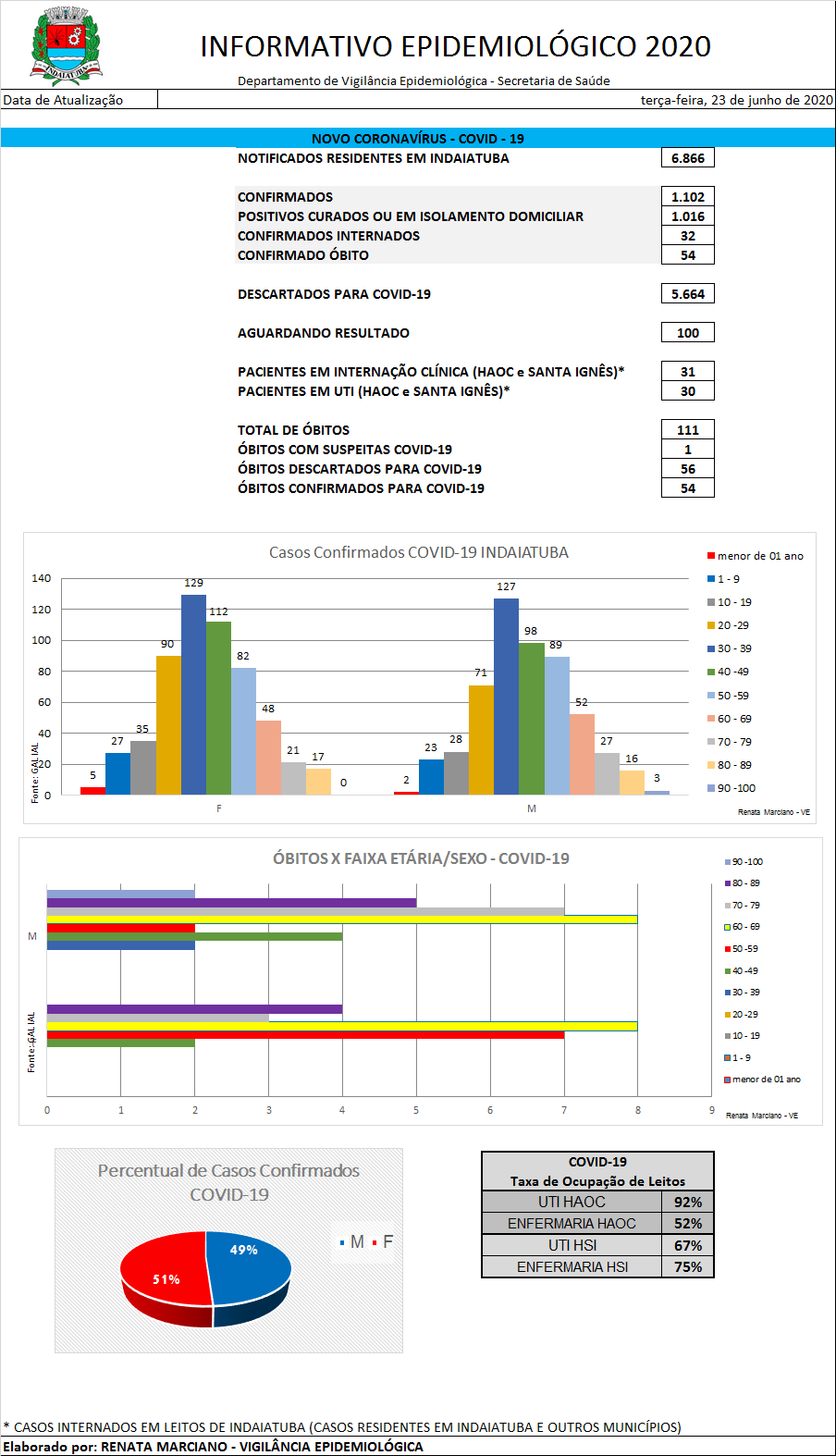 Na data de hoje foram acrescentadas 426 notificações, e outros 115 casos positivos de Covid-19, além disso, foram descartados 364 suspeitos. Sendo assim, Indaiatuba soma 6.866 notificações; 1.102 confirmados, sendo que 54 evoluíram a óbito; 1.016 são considerados curados ou estão em recuperação domiciliar e 32 confirmados estão internados. Ainda há outros 100 casos suspeitos aguardando resultado. Atualmente há 31 internados em leito clínico e 30 em UTI (Unidade de Terapia Intensiva). A taxa de ocupação dos leitos clínicos é de 52% para o Haoc e 75% para o Hospital Santa Ignês, referente aos leitos de UTI para o Haoc é de 92% e para o Hospital Santa Ignês 75%.