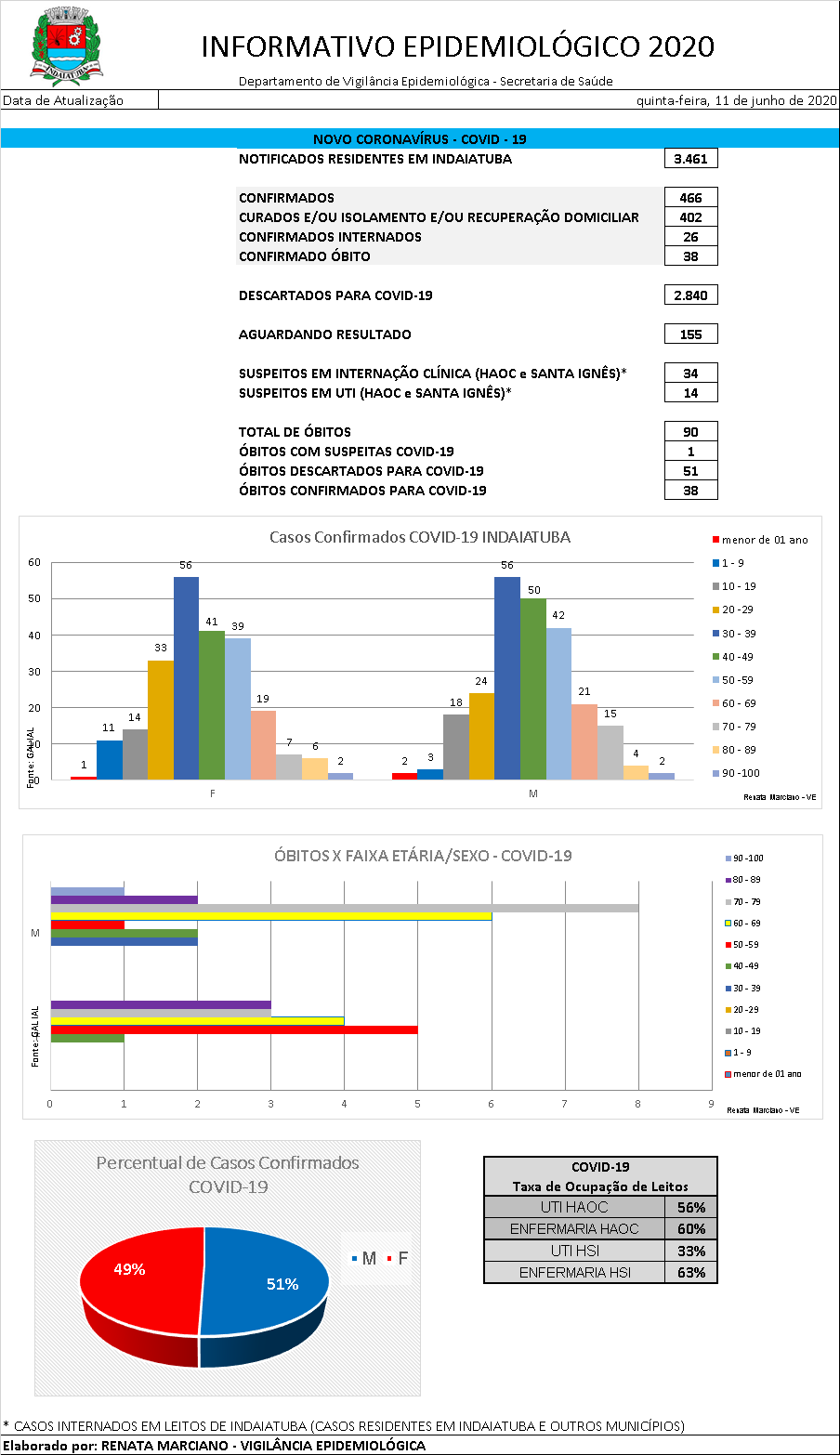 Na data de hoje foram acrescentadas 61 notificações e outros 28 casos positivos de Covid-19 além disso foram descartados 28 suspeitos. Sendo assim, Indaiatuba soma 3.461 notificações; 466 confirmados, sendo que 38 evoluíram a óbito; 402 são considerados curados ou estão em recuperação domiciliar e 26 confirmados estão internados. Ainda há uma morte em investigação e outros 155 casos suspeitos aguardando resultado. Atualmente há 34 internados em leito clínico e 14 em UTI (Unidade de Terapia Intensiva).