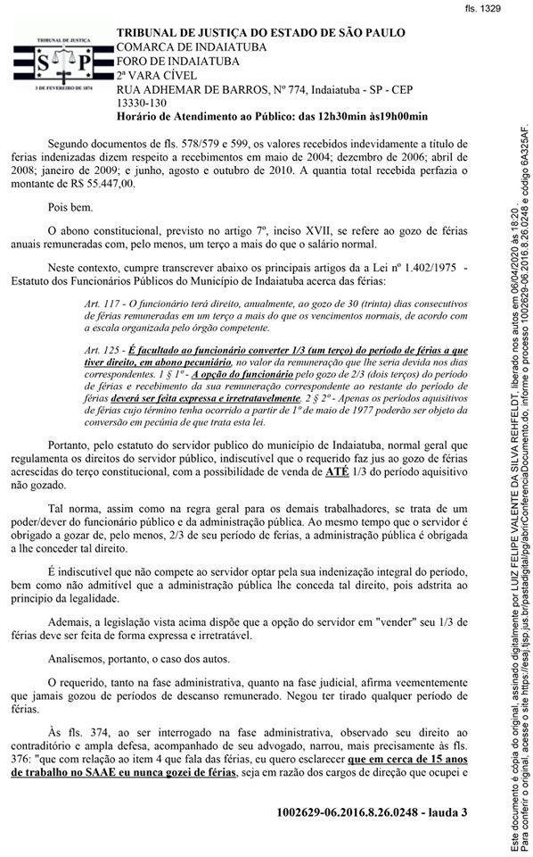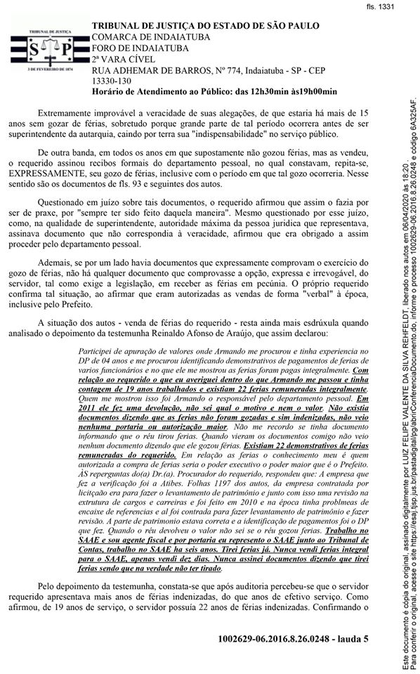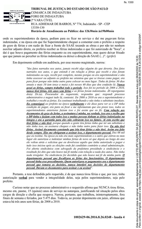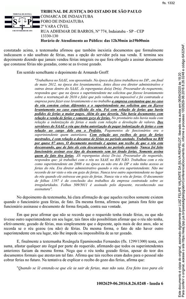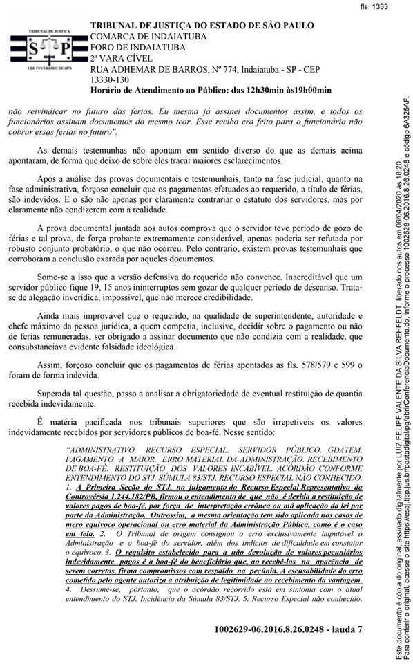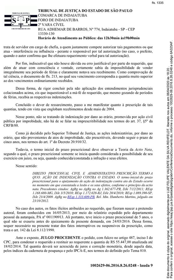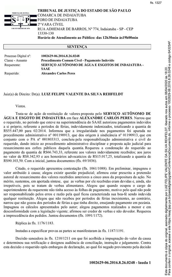 A medida foi tomada pelo juiz Luiz Felipe Valente da Silva Rehfeldy, da 2ª Vara Cível de Indaiatuba no último dia 6 de abril. De acordo com a sentença o parlamentar recebeu R$ 55.447,00, quando esteve na superintendência do Saae. Os pagamentos foram autorizados por ele, e considerados indevidos pela Justiça.