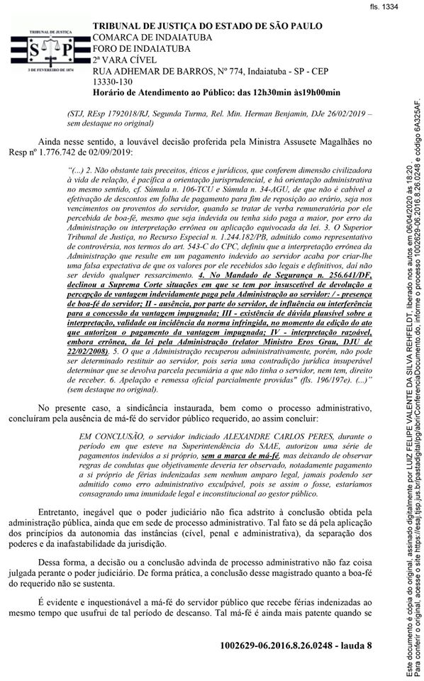 No processo, Alexandre Peres alega que não recebeu os valores cobrados, pois não gozou de férias inexistentes e tampouco tinha acesso às folhas de pagamento da autarquia.