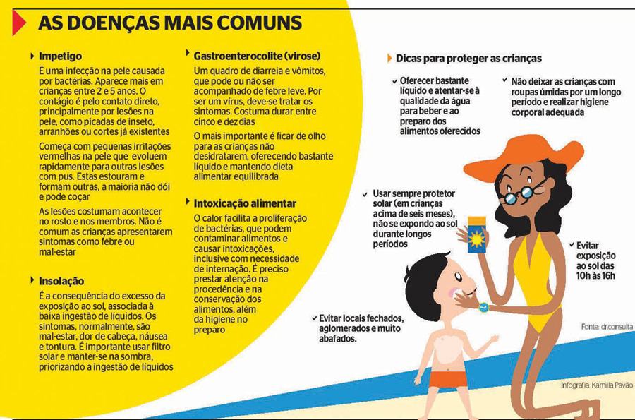 As férias de verão ainda não chegaram, mas o calorão vem dando sinais de como serão os próximos meses. Com isso, os cuidados com a saúde que a época exige, principalmente com os pequenos, já podem começar a serem seguidos. Nesse período, as crianças passam mais tempo na praia, na piscina, brincando na rua com os coleguinhas e, com isso, mais expostos a doenças características do verão.