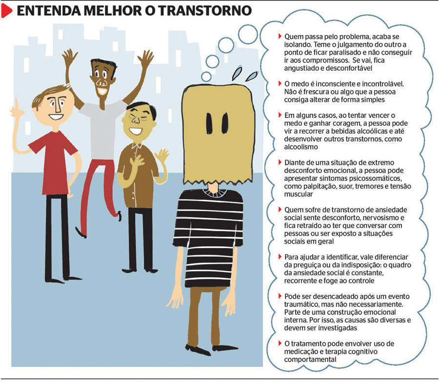 Por trás de inúmeros furos e desculpas para não ir a um encontro ou a um compromisso pode estar escondido um transtorno: o da ansiedade social. Quem sofre com ele sente-se angustiado quando precisa ir a uma dessas situações e desconfortável diante delas. É bem diferente da timidez, é uma sensação que paralisa. Mas, mesmo que incontrolável, tem tratamento.