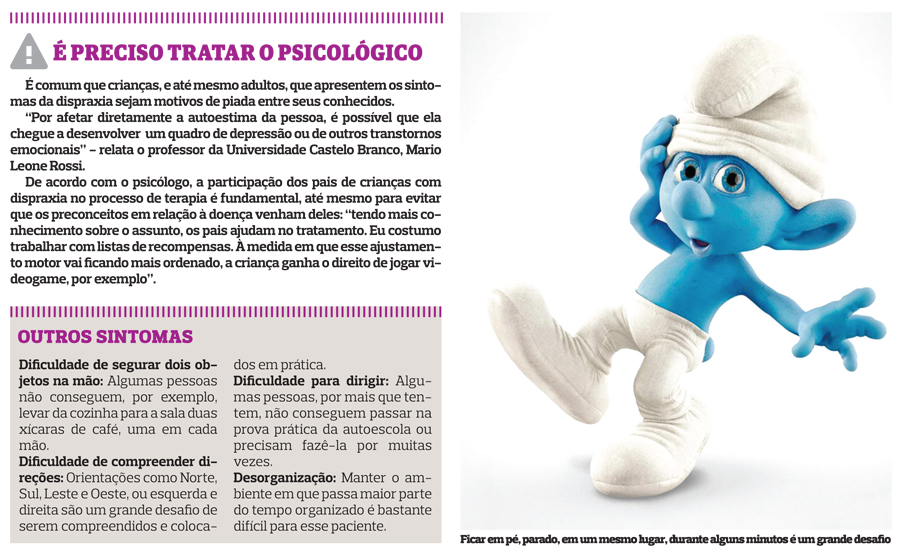 “A praxia é a capacidade de planejar, organizar e executar uma ação. A pessoa que sofre de dispraxia tem dificuldade em fazer uma ou mais tarefas, o que afeta diretamente ações diárias, como por exemplo, usar talheres para comer” – explica Saul Cypel, presidente do Departamento Científico de Neurologia da Sociedade de Pediatria de São Paulo.